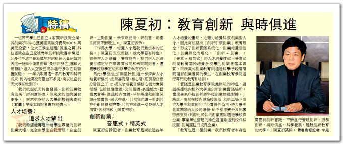 2011年12月12日《香港商報》A24版刊登專訪我校黨委副書記、副校長陳夏初的報道《教育創新 與時俱進》。 報道以我校學生創業典型周華獲得50萬美元風險投資、5位大學生組建的“鳳凰之翼”團隊在空客全球航空創意競賽奪得總冠軍、在全國“挑戰杯”大學生課外科技作品競賽中第五次捧回“優勝者杯”、由20多位平均年齡在30歲左右的科研人員研制的天巡一號微小衛星發射成功等學校近期取得的一系列教育和科研成果為切入點,報道了我校人才培養、創新創業教育等工作的經驗。 全文轉載如下: 陳夏初:教育創新與時俱進 一位研三學生已創立4家高新技術企業,其創樂呼叫中心獲美國風險投資商BHC50萬美元投資,5位大三學生組建“鳳凰之翼”科技團隊在空客全球青年創新挑戰賽中奪冠,20多位平均年齡30歲左右的科研人員研制的天巡一號微小衛星搭載“長征四號乙”運載火箭發射,進入太空后已成功進行多次在軌驗證試驗……一年內取得這一系列教育和科研成果,對內地高校而言并不多見,在南京航空航天大學卻做到了。 “我們航空航天特色發展、創新創業教育成果可謂初露崢嶸,但未來能做的還有更多。”南京航空航天大學副校長陳夏初接受本報記者專訪時表示。 人才培養:追求人才輩出 “我們希望能籌建一幢學生專屬的創新創業大樓,完全由學生自我管理,自主創新,主動創業,未來新技術、新創意、新產品源源不斷產生”,陳夏初表示。 “作為大學,培養人才是我們最根本的任務。”陳夏初侃侃而談,“辦大學要有特色,首先在人才培養上要有特色。我們把人才培養目標定位在“高素質公民和未來開拓者”,這是學校辦學定位和辦學使命決定的。” 為此,學校推出“群星計劃”進一步探索人才培養新模式,按照基礎層、核心層、拓展層分級分層確立了十二項人才培養目標核心能力素質指標,包括誠信意識、文明禮儀、表達能力、藝體素質等,通過校內宣講、平臺搭建和制度保障分類實施,深入推進。“目前我們這一計劃仍在不斷調整和完善,目的在于進一步發掘人才潛質,因材施教”,陳夏初說。 創新創業:普惠式與精英式 陳夏初告訴記者,創業教育是南航近些年人才培養的重點,尤著力培養科技創業型人才,因此南航堅持“創新引領創業”教育理念,形成了創新實踐系統化,創業培養個性化,創業孵化市場化,“創新+創業”,“普惠+精英式”的人才培養模式。普惠式創業教育基于培養全校學生創業者基本素質。而精英式創業教育則通過科學手段層層選拔有創業潛質的學生,在創業教育學院進行專門化教育和培訓。 “實踐是創業教育學院最鮮明的特色,通過搭建校內校外大學生創新創業實踐場所,實現學生科技創新與科技創業無縫對接。”為此,南航在校內建設校園版“創新工場”,成立大學生創業孵化中心實體性公司,通過開展項目遴選、投資鑒定、孵化指導等工作,將大學生創業團隊納入公司運營,給予相應資金及配套服務支持。對孵化成功的創業團隊通過學校與企業、事業單位搭建的綠色通道輸送到校外科技園、創業園注冊成為企業。 “教育也是一種創業,我們教育者本身也需要有創新意識,不斷進行管理創新、服務創新,與時俱進,科學發展,建設創新教育的大學。”陳夏初笑稱。 ![]() 新聞鏈接: 《香港商報》是中央級報,是中共在海外創辦的六大媒體之一,直接隸屬香港中聯辦領導。創辦于1952年,是周恩來總理親自確定辦報宗旨,其財經版深受中央領導和中央各部門的關注。是一份以經濟報道為主、以溝通香港和內地經貿往來為宗旨的綜合財經報紙。多年來,《香港商報》榮列“香港最受歡迎十大中文報章”,亦是在中國內地發行量最大的香港報章,目前讀者已達100萬以上。《香港商報》除在中國內地、香港發行之外,還在美國、印尼等多個全球華人區域發行。是中共在海外發行量最大、影響最廣的報章之一。 |