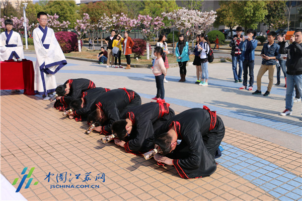 五位身著漢服的學生跪在墊子上,場地北段擺放著香案、香爐,在莊嚴的古琴演奏聲中,受邀嘉賓為幾位同學加冠。“以前聽說過古代男孩二十歲要行冠禮,但是這樣親眼見到是第一次,感覺學到了不少。”圍觀的李同學按捺不住,也想親身感受冠禮。