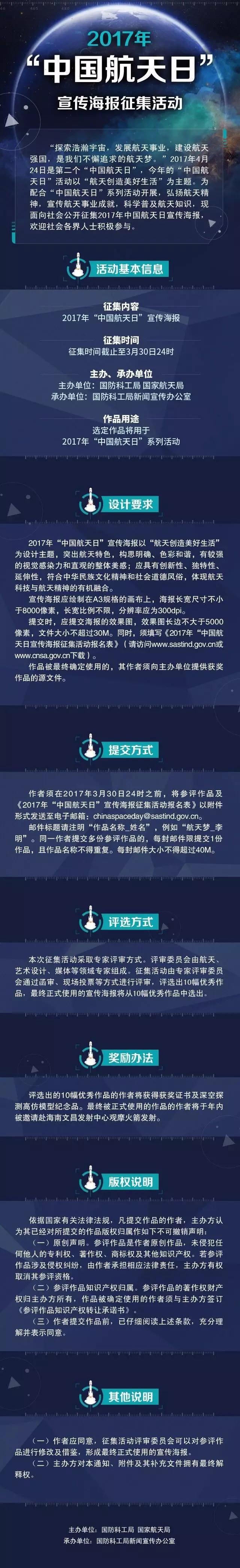 2017年4月24日是第二個(gè)“中國(guó)航天日”。在第二個(gè)“中國(guó)航天日”來臨之際,國(guó)防科工局、國(guó)家航天局面向社會(huì)組織開展宣傳海報(bào)征集活動(dòng),旨在激發(fā)廣大航天愛好者和專業(yè)設(shè)計(jì)人員的創(chuàng)作熱情,動(dòng)員社會(huì)公眾積極參與2017年“中國(guó)航天日”活動(dòng)。
