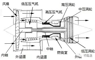 如上圖所示,渦輪風扇發動機其實就是在渦輪噴氣發動機的前方又加了一個巨大的“風車”,稱為“風扇”。風扇的直徑比壓氣機、燃燒室和渦輪都大,多出來的那一截形成了一個新的、不經過壓氣機燃燒室和渦輪的空氣流路,稱為“外涵道”,而經過壓氣機燃燒室和渦輪的空氣流路就成了“內涵道”。風扇和壓氣機一樣是由發動機后部的一組渦輪驅動的。在上圖的三轉子發動機中,風扇與低壓渦輪、低壓壓氣機與中壓渦輪、高壓壓氣機與高壓渦輪分別由里外嵌套的三個軸連接組成三個相互獨立的轉子,從高壓到低壓轉速逐漸降低以適應各自不同的工作條件。