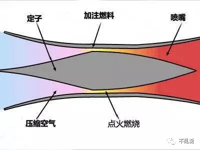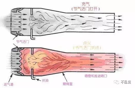 脈沖噴氣發動機也是由納粹德國在1944年發明的,被用于推進世界上第一種巡航導彈V-1。之所以被稱為“脈沖”,是因為它產生的推力不是連續的。發動機主體就是一個圓筒,前部有一個“節氣活門”,相當于空氣單向閥,它使得空氣只能從進氣口向發動機內流動而不能流出發動機。首先給脈沖發動機一個速度,空氣由于自己的慣性流入發動機;之后發動機圓筒內的油嘴噴射煤油,煤油被點燃,產生的燃氣由于發動機前部“單向閥”的阻攔只能向后方逃逸,從噴口噴出產生推力;由于燃氣的慣性,燃氣在圓筒內氣壓已經與外界平衡之后仍會繼續向后流動使得圓筒內暫時產生負壓,“單向閥”被外界大氣壓頂開,新鮮空氣再次流入發動機,開始下一工作循環。