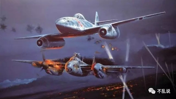 (油畫上部就是世界第一種實用噴氣式飛機——納粹德國Me-262“飛燕”戰斗機,有人評估其綜合性能是最好活塞式戰斗機美國P-51的七倍!多虧高昂的制造成本和高故障率限制了其數量,要不然能否擊敗納粹空軍還是個問題)