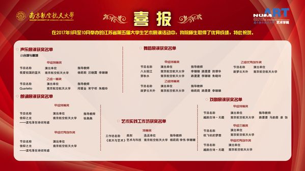 學院師生還先后參加了全國美展、“挑戰杯”中國大學生創業計劃大賽、全國青年普通話競賽、CUBA全國大學生籃球賽、全國大學生藝術展演、江蘇省大學生藝術展演活動、國家漢辦主辦的中外交流活動、長三角青年聲樂比賽、上海國際舞臺美術學術會議作品展、布拉格國際舞臺美術作品展覽、中國美術作品展和中國當代篆刻藝術大展等重要展演活動并獲得獎項百余項,在國內外文化藝術舞臺上鐫寫著南航的藝術名片。