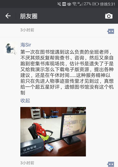 無獨有偶,10月30日,有學(xué)生轉(zhuǎn)發(fā)給圖書館員一條朋友圈信息,一位昵稱“海Sir”的學(xué)生發(fā)了這樣一條朋友圈:“第一次在圖書館遇到這么負(fù)責(zé)的坐班老師,不厭其煩反復(fù)幫我查書、咨詢,然后又親自跑到密集書庫現(xiàn)場找,估計書是遺失了于是又給我演示怎么下載電子版資源,提出各種建議,還是在午休時間……這種服務(wù)精神以前只在先進人物事跡宣傳里才見到過,真想給一個超五星好評,遺憾圖書館沒有這個機制。”