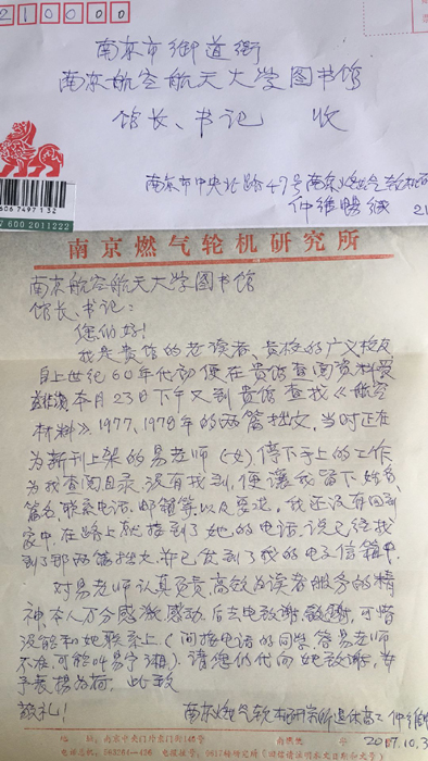 您們好!我是貴館的老讀者,貴校的廣義校友,自上世紀(jì)60年代初便在貴館查閱資料,受益匪淺。本月23日下午又到貴館查找《航空材料》,1977、1978年的兩篇拙文,當(dāng)時正在為新刊上架的易老師(女)停下手上的工作為我查詢目錄,沒有找到,便讓我留下姓名、篇名、聯(lián)系電話、郵箱等,以及要求。我還沒有回到家中,在路上就接到了她的電話,說已經(jīng)找到了那兩篇拙文,并已發(fā)到了我的電子信箱中。對易老師認(rèn)真負(fù)責(zé)、高校為讀者服務(wù)的精神,本人萬分感激、感動。后去電致謝,可惜沒能和她聯(lián)系上(問接電話的同學(xué),答易老師不在,可能叫易寧湘),請您們代向她致謝,并予表揚為荷。