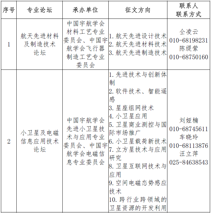 大會(huì)學(xué)術(shù)論壇現(xiàn)面向國(guó)內(nèi)外征文,經(jīng)專家評(píng)審后的論文將推薦到《宇航學(xué)報(bào)》《中國(guó)空間科學(xué)技術(shù)》《南京航空航天大學(xué)學(xué)報(bào)》增刊、《西北工業(yè)大學(xué)學(xué)報(bào)》增刊、《航天標(biāo)準(zhǔn)化》《航天電子對(duì)抗》《航天控制》《Advances in Astronautics Science and Technology》(英文刊)、《小衛(wèi)星技術(shù)與應(yīng)用》(內(nèi)部)等刊物發(fā)表。其余論文將以大會(huì)論文集的形式正式出版。歡迎大家踴躍投稿并積極參會(huì)。現(xiàn)將有關(guān)征文事項(xiàng)通知如下:
