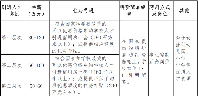 學校根據聘期工作目標及任務、學科類型等不同情況,結合國家提供的經費,配套相應科研啟動經費、薪酬(可實行年薪制或人才津貼制)、實驗及工作場所、科研助手、住房待遇等(基本標準見下表,學院可進行待遇補充,一人一議)。