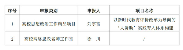 根據(jù)省委教育工委、省教育廳《關(guān)于開(kāi)展江蘇高校思想政治工作質(zhì)量提升工程有關(guān)建設(shè)項(xiàng)目申報(bào)工作的通知》(蘇委教函〔2022〕19號(hào))要求,經(jīng)自主申報(bào)、專(zhuān)家評(píng)審等環(huán)節(jié),擬向省教育廳推薦2項(xiàng)江蘇高校思想政治工作質(zhì)量提升工程有關(guān)建設(shè)項(xiàng)目,現(xiàn)予以公示,名單如下: