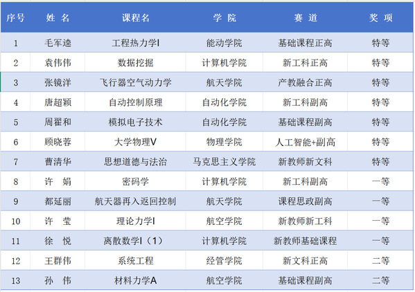 能源與動(dòng)力學(xué)院毛軍逵、計(jì)算機(jī)科學(xué)與技術(shù)學(xué)院袁偉偉、航天學(xué)院張鏡洋、自動(dòng)化學(xué)院唐超穎、周翟和、物理學(xué)院顧曉蓉、馬克思主義學(xué)院曹清華7位教師榮獲特等獎(jiǎng),計(jì)算機(jī)科學(xué)與技術(shù)學(xué)院許娟等4位教師榮獲一等獎(jiǎng),經(jīng)濟(jì)與管理學(xué)院王群偉等2位教師榮獲二等獎(jiǎng)。