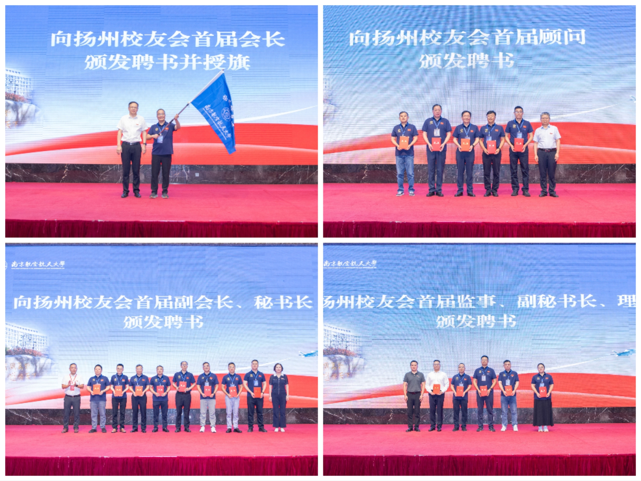 張啟錢為揚(yáng)州校友會(huì)首屆會(huì)長頒發(fā)聘書并授予會(huì)旗,校友總會(huì)副會(huì)長李遙為首屆顧問頒發(fā)聘書,審計(jì)處處長劉紅旗和外國語學(xué)院黨委書記左彤云為新任副會(huì)長、秘書長頒發(fā)聘書,李和新為首屆監(jiān)事、副秘書長、理事頒發(fā)聘書。