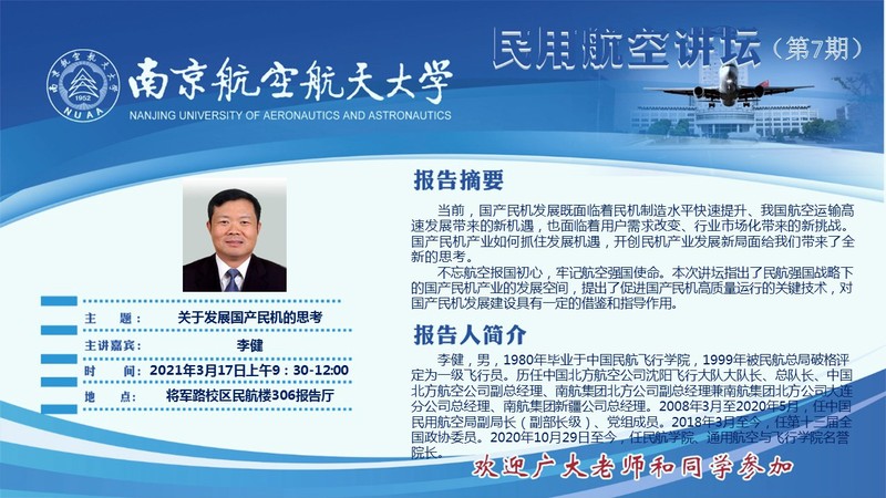不忘航空報國初心,牢記航空強國使命。本次講壇指出了民航強國戰略下的國產民機產業的發展空間,提出了促進國產民機高質量運行的關鍵技術,對國產民機發展建設具有一定的借鑒和指導作用。